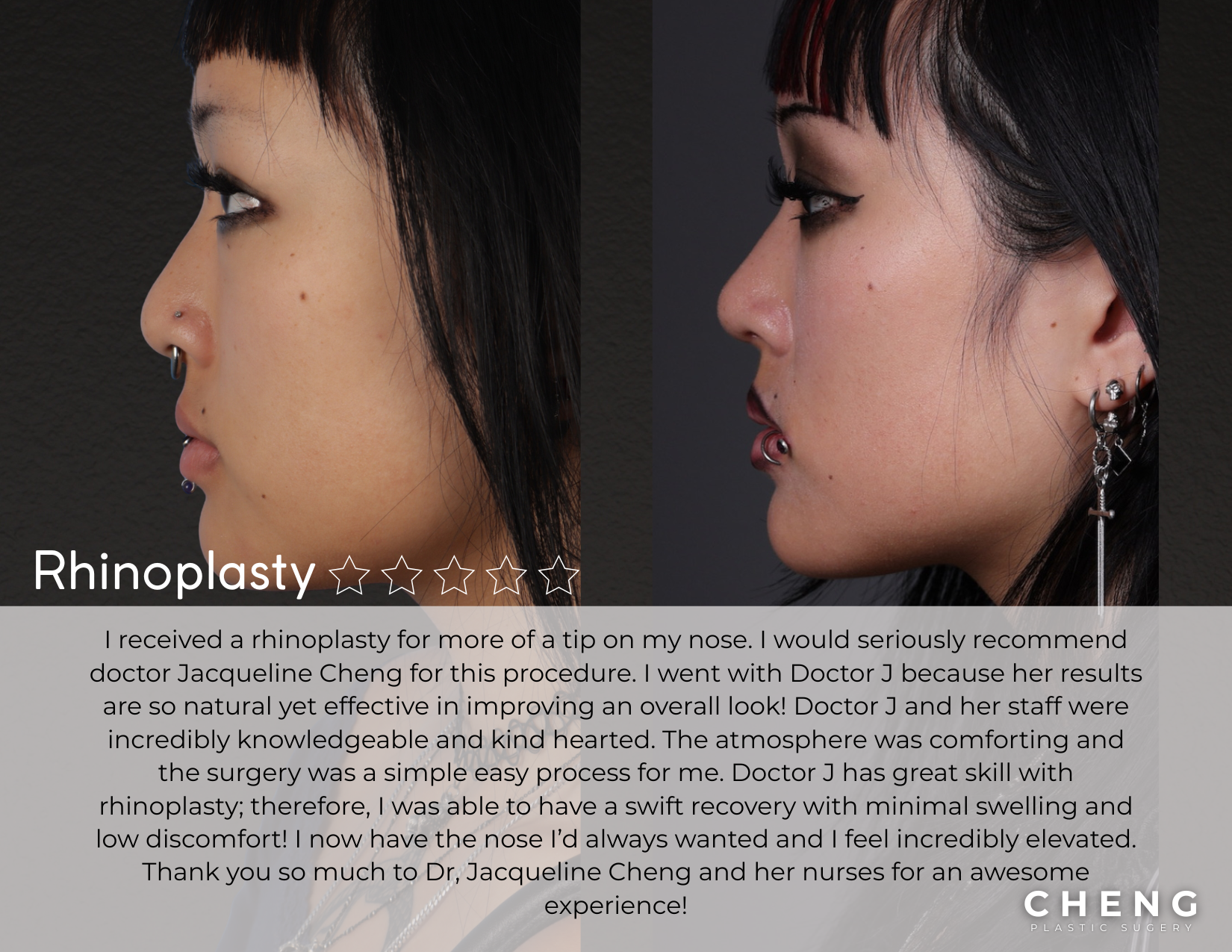 SUCH a great experience with Dr. Elbert Cheng and Dr. Jackie Cheng. Everyone at the practice is so nice to work with, helpful, friendly, and accommodating. I was well informed prior to the procedures received. There were no surprises and everyone at the practice ensured I had everything I needed. Healing was such a smooth experience because of all the prep provided. I could not be happier with the results. Thank you Dr. J and Dr. E and everyone at the practice!!