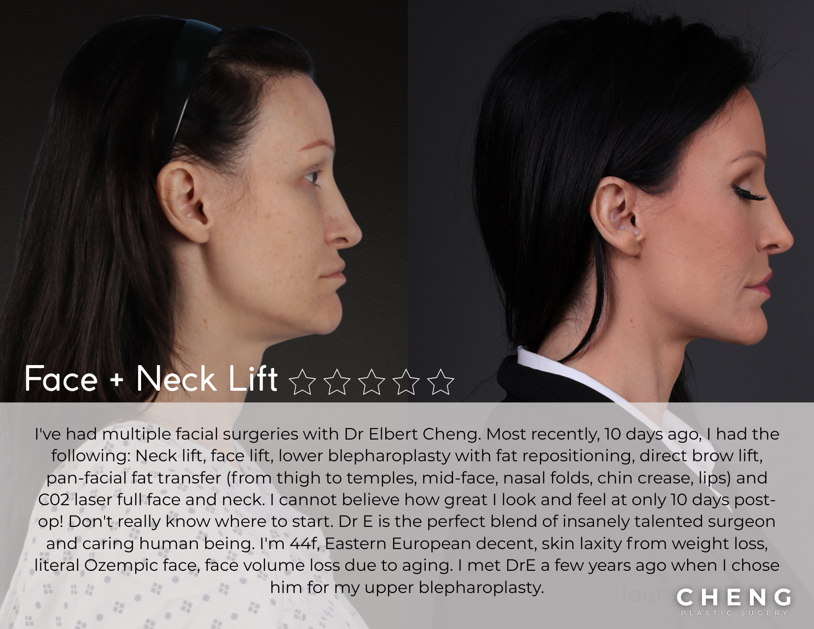 Great experience with staff and procedure. I got upper blepharoplasty done in Sept with Dr. Elbert Cheng. From day one the staff was kind and very helpful. During my consultation with Dr. Cheng he was so informative and kind, great bed side manner. He was honest when I asked about other surgeries stating that I didn’t need them at this time, and gave great feedback as to why I didn’t need it and why I should wait. I love my results and healed very quickly. All in all a great doctor who is experienced and very knowledgeable in his field.